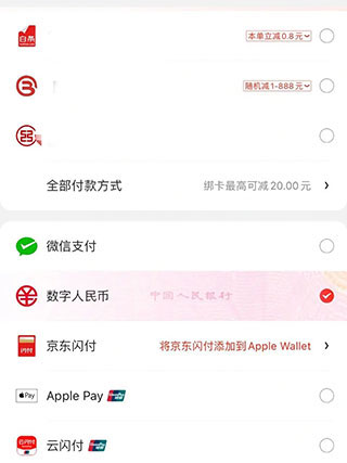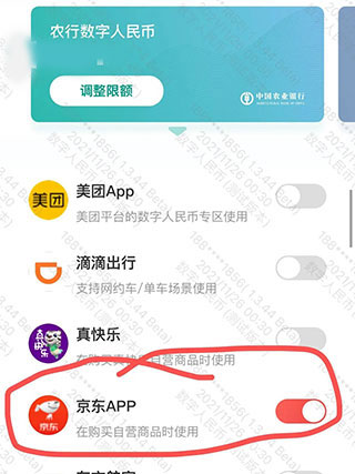 3、数字人民币app支持很多支付途径,每个app下面有说明限制商品类型,点击对应按钮打开数字人民币使用,以京东为例,打开数字人民币用于京东开关后,在京东自营店购买东西支付时会出现数字人民币选项。