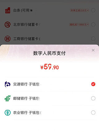 4、选中数字人民币点击下面的确定,出现所有用于支付京东商品的数字人民币对应的银行。