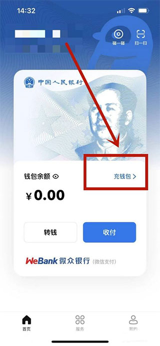 1、首先我们打开数字人民币app,会出现带有人民币图案样式的卡片,卡片上会显示当前余额,而且右下角还会显示所在行。