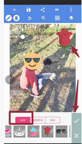 4、点击“帖纸”,选择您想要加入的帖纸,放置合适的位置和调节大小,点√号保存,显得更漂亮