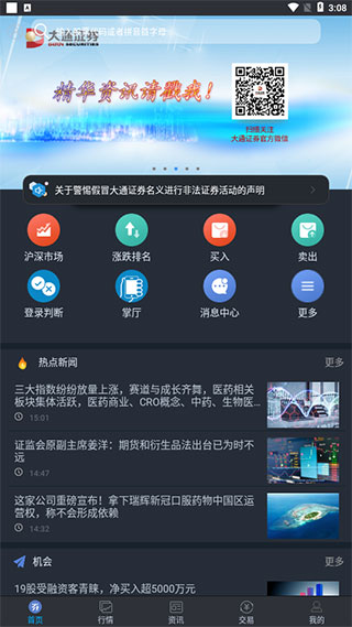 大通证券手机版是一款手机交易证券类的软件,集合了行情分析查询、交易委托、期货、证券服务等功能于一体,用户可以使用它进行股市行情查询、在线交易等快捷操作,非常的便捷。软件内有着强大的资讯内容,囊括财经热点新闻、行业动态、个股机会、新股资讯、数据掘金、港股、美股、基金、理财等全面资讯内容,用户可以了解到股市界最实时的消息,当掌握这些是远远不够的,该软件还会给用户自动汇出一幅股市树形图,能够简单直观的帮助你了解到各个股票的涨跌。此外,大通证券手机版还有着快速交易功能,普通股票包括股票买卖、新股申购、基金申赎、债券回购等交易功能满足您的投资所需,闪电交易,用可在个股分时页快捷下单,节省超过30%的下单时间,交易快人一步,让投股更加的安全。