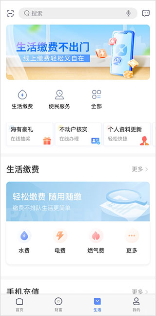 3、在生活模块中,用户可以进行水、电、燃气、广电费用的缴纳操作。