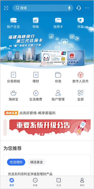 1、进入福建海峡银行手机银行app后,用户可以在首页中进行账户总览、转账等操作。