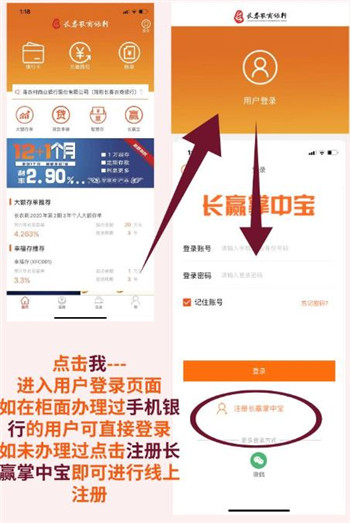 2、点击我---进入用户登录页面如在柜面办理过手机银行的用户可直接登录,如未办理过点击注册长赢掌中宝即可进行线上注册。