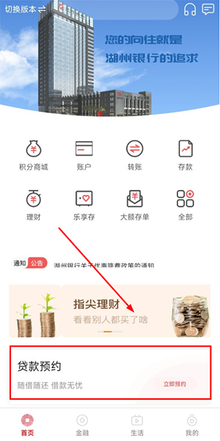 1、首先登录湖州银行app最新版本,在首页下方点击:贷款预约。