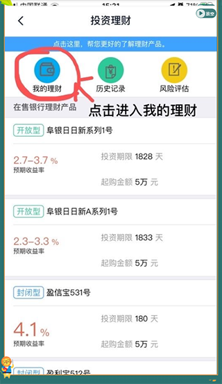 2、进入【投资理财】页面后,在左上方点击【我的理财】即可查看到您已经购买的理财产品。