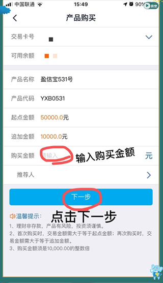 4、进入产品购买页面后输入购买的金额,点击【下一步】后,进行购买,即可完成购买。