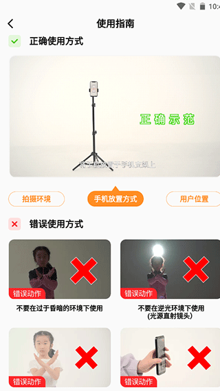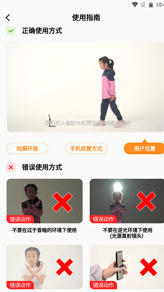 用软件拍摄视频时,不要在过于昏暗的环境下使用,不要在逆光环境下使用(光源直射镜头),衣服颜色避免与背景颜色相似或相近,且避免手持手机拍摄。