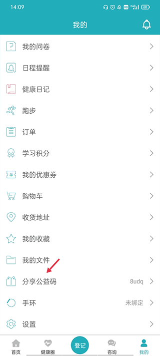 5、往下翻就会看到一个分享公益码,只要注册了账号并登录进来,就会得到一个公益码的。