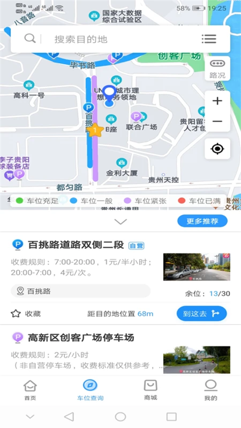 目前app覆盖贵阳市全市停车资源,可展示地图页面内每个车场的情况,包括距离、余位、收费规则等。