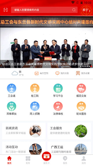 广西工会app是专门为广西人民开发的一款公会服务软件,包含了工会通、桂工院、职工书屋等一大堆服务功能,用户可以在这里办理绝大多数的工会服务项目,并做到实时跟踪,极大地方便了工会工作服务的开展与实施。软件以移动互联网为主要通道,涵盖招聘、法律、帮扶、二手交易、优惠活动、新闻资讯、政务党建等方方面面内容,为全省广大职工会员提供更加普惠化、精准化的线上服务。此外,软件拥有工会通、法律维权、互动活动、网上招聘、服务地图等多种多样功能,还会不定期举行活动,包括技能学习、就业工作、法律援助等,给人民带来福利的同时,也给用户解决了部分困难。广西工会这款软件主要作用是服务于人民,为人民排忧解难,是一款非常不错的软件,需要的用户可以下载安装使用。