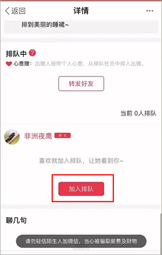 4、如有人对闲置物品喜欢,可以在发布的闲置帖子内,点击【加入排队】来领取闲置衣服;