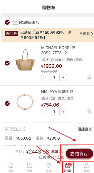 3、点击页面【购物袋】,进入购物车查看添加的商品,可以选中想要的商品,点击“去结算”提交订单,进入结算页面。