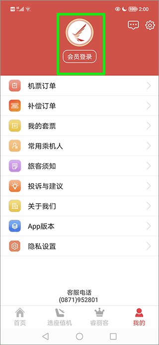 1、打开瑞航易行app,在这个界面找到并点击绿色方框内的会员登录按键;
