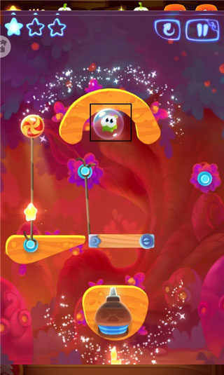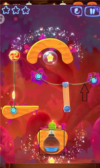 技巧:这一关通过额外任务的只有一个方法,不过运气成分有点高,主要是切割糖果上面和右边绳子的相隔时间,掌握一个时间间隔就能快速掉到下面的石壁(而不被Toss抓到),进行一个反弹,然后收集两颗星星并过关。