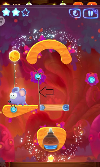 7、根据箭头指示,割断糖果的绳子,最终老鼠将吃掉糖果,完成通关。
