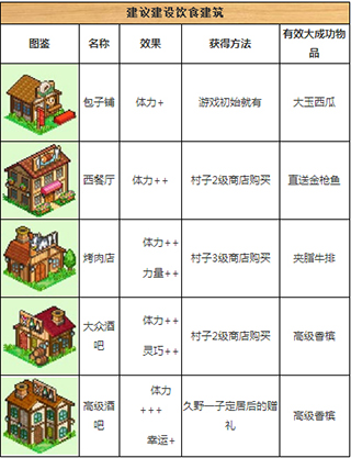 想要在通关之前尽量成功的建设好村子,对于设施建筑的选择也有一定的套路。因为到了游戏的后期许多建筑都要更新换代到最具性价比、效果最好的高级建筑,所以前期建筑尽量挑过渡性好的。在上面的表中大致就是各时期建议建设的设施建筑。不过要强调的一点在于旅馆是个很特殊的建筑,争取在第一时间把价格提升到最大。因为旅馆使用的频率最高,虽然盈利少但是积少成多以后也非常可观。