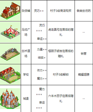 其实在冒险迷宫村游戏中建筑可以无限收纳人进入,没有限制。所以鉴于这个特点一般在建造建筑的时候只需要建设一间即可。一般建筑主要起到灵巧、幸运、力量、魔力以及结实属性的加成效果。而各建筑在不同时期却有些设施建筑特有相同的效果,这时候就需要根据性价比做出一些取舍来建设。