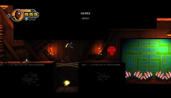 珠子在关卡各处都有,一般小型珠子都在行进的道路旁,大型珠子和黑字则需要一些跳跃技巧进入相对隐蔽的区域获得,关卡中还有各类障碍需要破除,图中的隔板就需要冲刺攻击打碎才能前进。通关所用时间也是游戏的重要评定因素。因此除了操作熟练,还需要简化操作,图中下方的敌人就可以利用跳跃冲击攻击,同时吃到沿途的珠子。