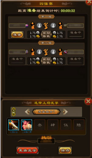 比赛开始前系统会提供参赛大侠一段时间修改武学组合设定,玩家可以点击【准备】进行设定。玩家更换武学时间段内,任何玩家无法点击小头像查看属性面板,助威时间段开放选手小头像供大侠点击查看面板。