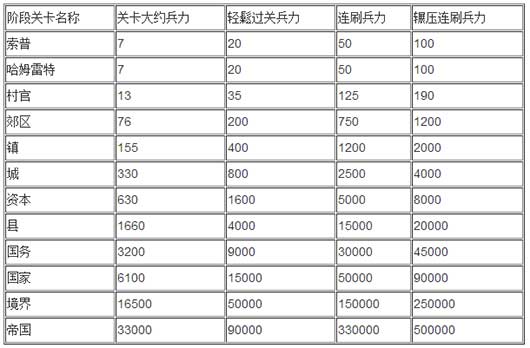 这时候就需要了解各阶段关卡敌人的兵力状况来分配自己的兵力,此时有一个重点当以优势兵力出征时自己损失的兵力会非常少,当然当你兵力超过关卡兵力时就可以过关,但是这样会造成兵力损失过多造成要等人口补兵的问题如此就无法一直刷骷髅,根据自身经验建议兵力如下这样刷关卡可以免去等人口补兵的问题