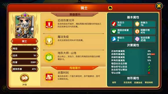 关键在与他后五次的单位升级,使他成为了一个别具一格的单位。金2的强化魔法盾,对于强化生存能力有很大的帮助,骑士冲击,加农炮的怒吼,不过40血,因为法师机动强且灵活,一般站位会比较好,要打三刀才能解掉,而对手不愿意也根本没有机会打法师,法师平常还是站城恢复的常客,很难死。法师作为对手很恶心,输出挺高,卡位也有点厉害,你还不太愿意动他。金3的冰冻术实用价值较大,没有cd,一回合可以两冻,对低移动的单位很实用,我往往用来冻气球。钻一放风筝,名副其实,不能放风筝的法师,不是法师,机动能力对法师很重要。钻二加属性。钻三,一看就是神技,天生自带双攻击,双杀双补刀,或者消耗满血单位,或者控制不走位就无法输出的地方单位,打一个单位基本必死,这个技能还有一定的附加价值,它使加攻击的地形更加有效,然后法师能够获得双倍的经验,法师升级贼快。