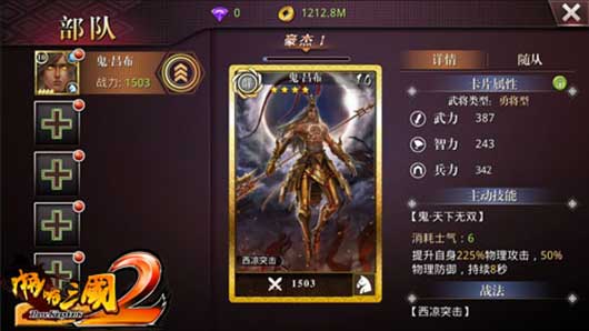 从真·吕布进阶成鬼·吕布后,武力、智力、兵力再次大幅度提升,主动技能鬼·天下无双提升自身225%物理攻击、50%物理防御。
