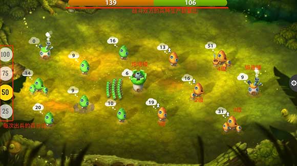 最后,当建筑物一半以上都满3级或占领对方领土达70%时,就可以调整出兵的百分比为75%,加速攻击的力度。