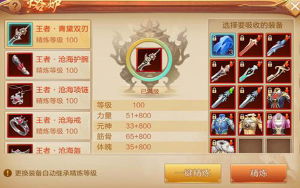 6、玩家可以通过喂养装备或精炼石来提升精炼等级,并且精练等级为继承属性,不会随着更换装备而清零