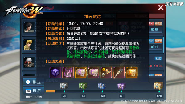 在《拳皇世界》中,当玩家等级达到30级并加入社团,在活动开启的三个时间段:13:00、17:00、22:40即可通过活动界面进入神器试炼,试炼时长为1个小时。