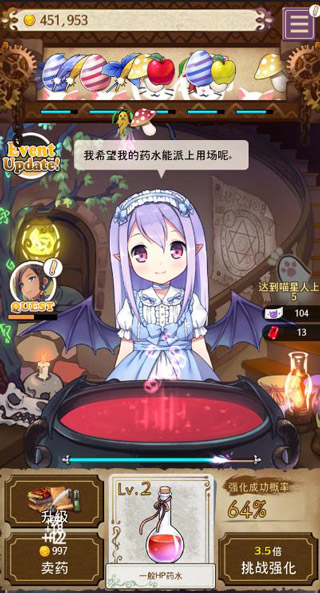 2、游戏玩法就是把材料放入锅中,炼成药水,然后卖钱,然后升级素材制作更棒的药水