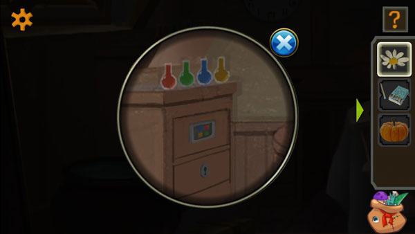 看到左边柜子上摆放的药水顺序:红色、绿色、蓝色、黄色。