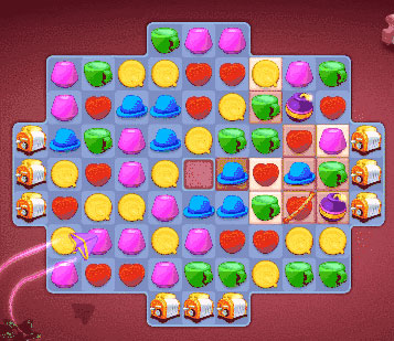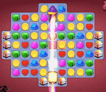 - 飞弹:将相邻的4个元素组成一个方块(或5个元素组合成一个梯形)即可合成一个飞弹。双击飞弹或或将其和附近的一个元素进行交换即会随机消除一个元素。