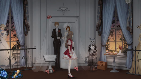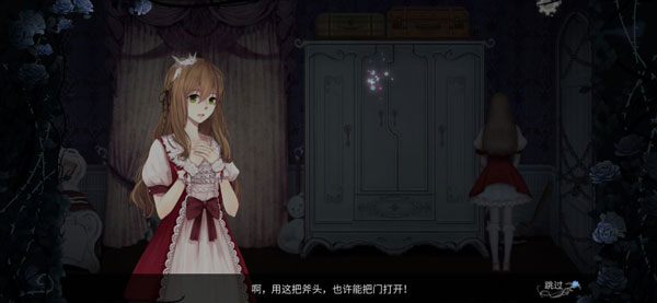 碰到了花瓶,捡起白玫瑰,用锤子砸碎茶几上的红酒瓶,把白玫瑰染成红色,和白裙子搭配起来,然后茶几右边的椅子下面有个红裙子玩偶,点击之后有个纸条,要和她要捉迷藏,把红裙子给玩偶,得衣柜的钥匙,进衣柜,过一会就出来了,门就破了。