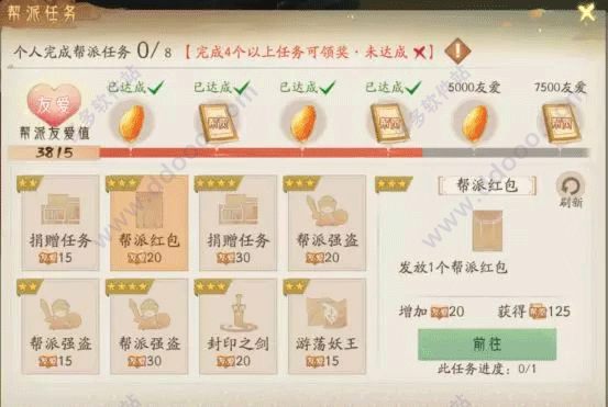 八、每天上线第一件事,建议大家打开帮派,进入活动选择“帮派任务”,优先查看一下今天的帮派任务有哪8个,如果不想做的(比如要求发放帮派红包)可以刷新掉,每天可以免费刷新一个任务,再操作需要花费10通宝20通宝,可以不亏。