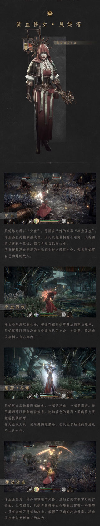 特点:火枪上的刺刀,对敌人韧性槽的削弱效果明显。依靠精力上的优势,较强的机动性,在战斗中可以流畅的做完一套连招,配合异常状态下的加成,能打出具有爆发性的伤害。武器火枪可以在战斗中对敌人进行的消耗。简单的机制可以让玩家轻松上手,是新手玩家的不二之选。