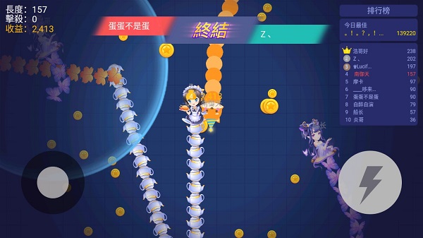 长按加速,用巧妙的走位让蛇身被别人撞上,就可以吃掉对方收集的金币迅速变长。