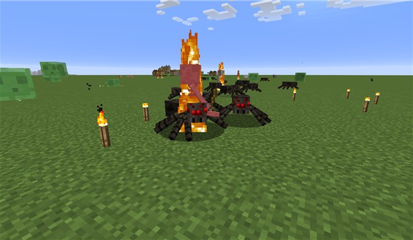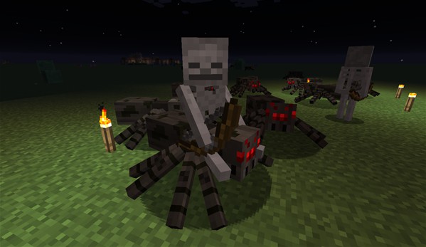不过,有趣的是,白天蜘蛛并不会因为有骷髅射手骑着它们就变得凶暴起来,而骷髅射手也不会因为骑在蜘蛛上而变得免疫阳光,因此,这一对组合在白天变得异常乏力——蜘蛛对你没什么兴趣,而骷髅射手很快则会被阳光灼烧致死。
