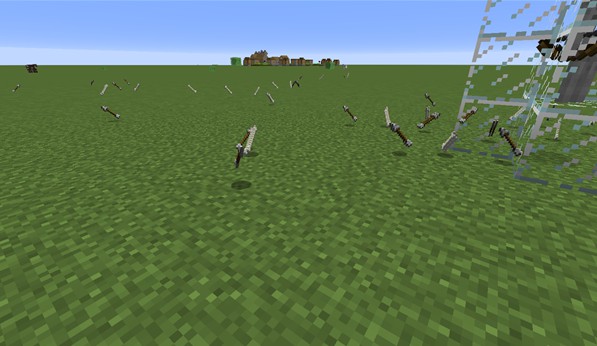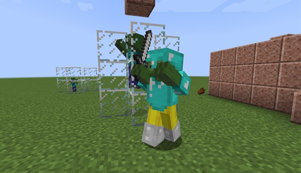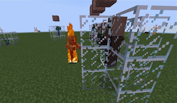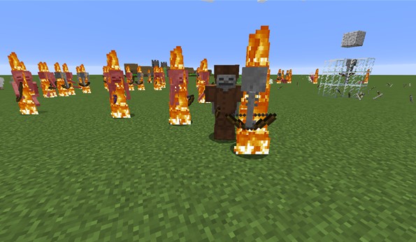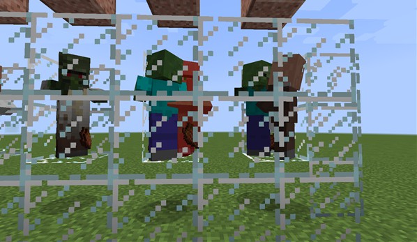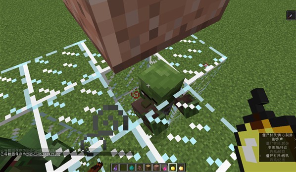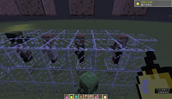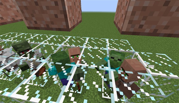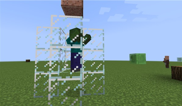 当然,这些僵尸的袭击是有原因的,只要村民丧命于他们的手中,就会有可能被转化成为僵尸村民。为了更好的说明,在这里做了个小小的装置用于观察村民与僵尸的转化。