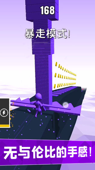 操作方面,该游戏是很经典的酷跑玩法,操作简单,玩家控制小人左右移动不断躲避障碍物向前奔跑,每到一个区域块,游戏都会提前发出颜色警示,玩家可以趁此预判改变奔跑的轨迹,在正确的路径中将所有砖块叠加起来,如果砖块的颜色叠加错误,那么砖块的数量就会对应的减少,将所有的砖块成功叠加起来后,最后一步的操作就是一脚踢倒,砖块会平铺的掉落下来倒在倍数框里,砖块叠加的越多那么倍数就越高,获取到的金币数也越多。