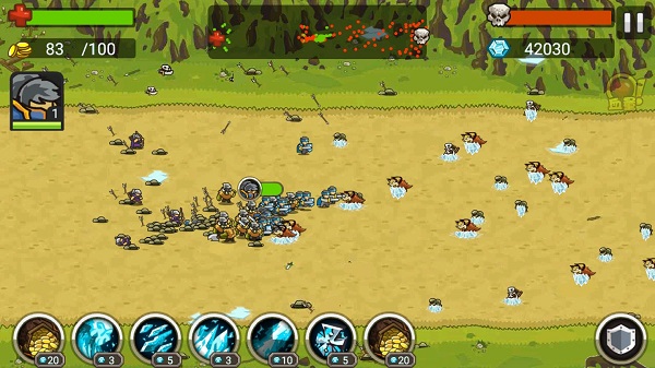 玩家进入关卡前先选择要派出的英雄,士兵和可使用的技能;在关卡会自动增长金币,消耗金币选择我们要召唤的士兵,用钻石可以释放技能帮助我们击杀大量的敌人,把对方的大本营毁灭或者击杀关卡BOSS即可获得通关。