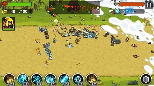 (2)击杀敌人会加快金币增长,要不断地召唤士兵,前期的士兵和弓箭手非常好用,不要想把战场推到敌人大本营那,放在自家大本营前还有NPC可以帮我们消灭敌人。
