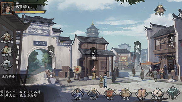 1、游戏画面经典的还原江湖小镇,拥有副本、历练、挑战、商城以及任务