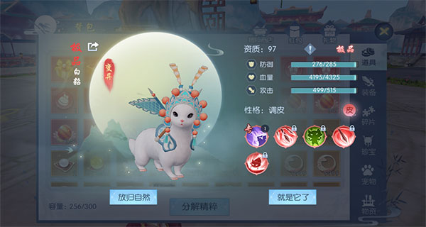 如果玩家对自己的爱宠不满意,是可以放生的,点击放生按钮即可放生宠物,放生宠物可以获得若干宠物口粮,可以用于其他宠物升级。