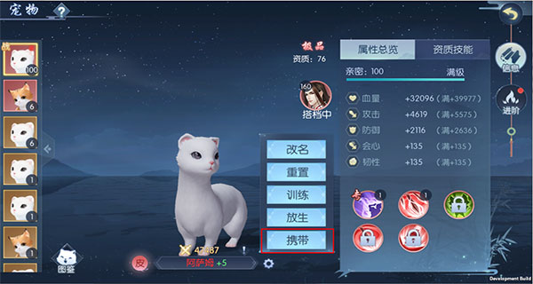 养宠千日,用宠一时,宠物宝宝们也是可以跟随主人一起出战的,点开人物面板后在属性栏旁边有个上阵宠物的按钮,点开后可以选择助战宠物,选择后宠物就可以和主人一起战斗啦,划重点,每个随从都能携带一只宠物!上阵宠物后,宠物的属性就能附加到主人身上了,没有骗你哦,是100%属性完全附加哦,是不是很强呢?