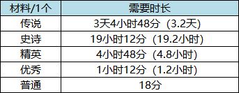 大家可以根据想要的装备材料数量推算装备制作周期。不过由于一些特殊活动都会给材料,一件装备制作周期大约可以缩短到80%的时间,可以根据具体装备自己计算。