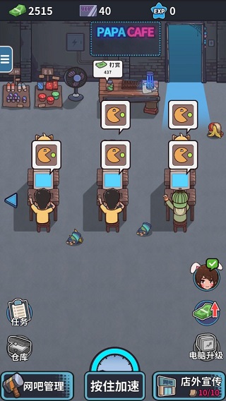 游戏前期会有新手指导,但即便没有也不会影响玩家对于该游戏的实际体验,因为本身的玩法还是非常简单的,基本的方式就是点点点,不过随着钞票的积累,你需要不断的升级电脑、电脑桌及其他自主商品区。首先一点就是店外的宣传,在每次客人经过的路途中点击客人便可发放传单,这样便能增加店内的流量;二点就是经典,但客人坐下来的时候,点击头上的图标便可开始游戏,不过有的电脑可嫩没有安装上顾客喜爱的游戏,此时的动态会有不同表情作为回应;三点就是点击地上的钞票。