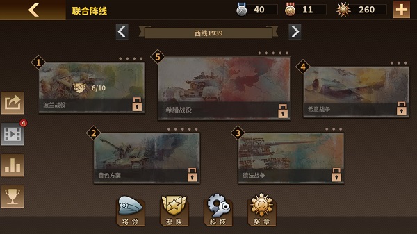 联合阵线:指的是打关卡和系统送的特种部队进行自己排兵布阵,这点玩法蛮有新意的。开启联合阵线需要自己特种部队数量达到目标要求的数量,比如西线要求10个特种部队。