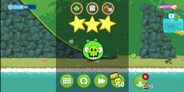5、过关之后,会给出三个星星的评价,如下图所示,第一个代表猪头到达目的地,第二个代表获取五角星,第三个代表在指定时间内完成关卡。如下图,没有获取第三个星星,那可以重新开启本关,单独获取第三个星星