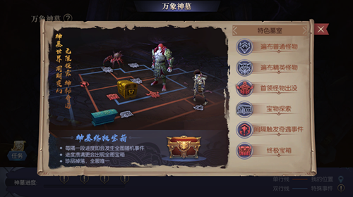万象神墓本身像是一个由许多房间组成的迷宫,玩家需要在每一个房间中探索完成事件,并找到通往其它房间的入口。万象神墓中有许多的随机事件、随机怪物、宝箱和特殊委托。